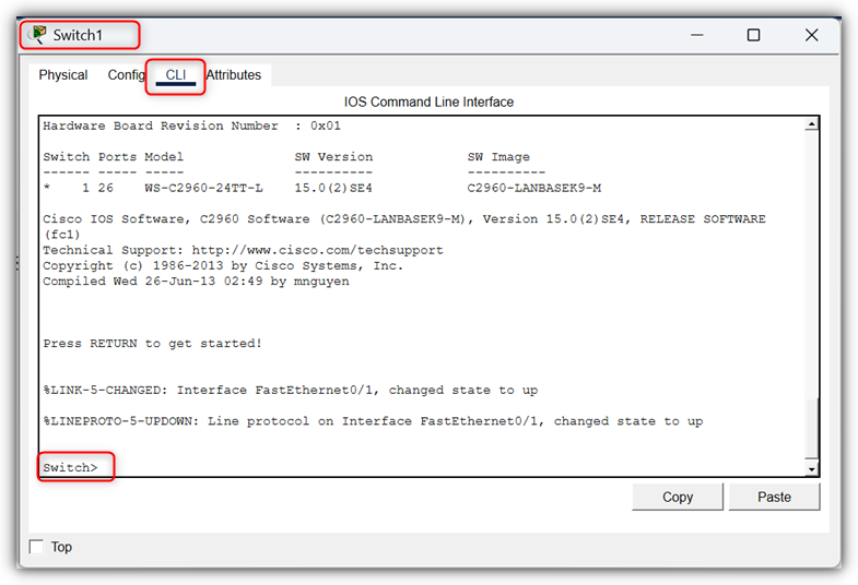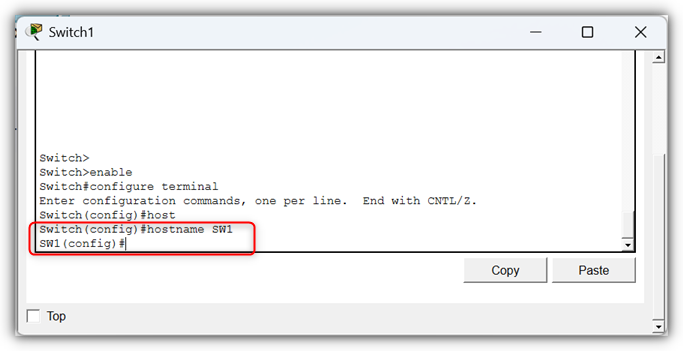 Every Cisco device should have its own name instead of the default "Switch." A name (hostname) helps you know which device you are working on, especially when using remote access like SSH.