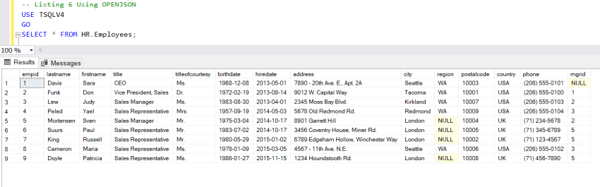 In order to represent the JSON data as the complete relational table, we started within Listing 2, we must specify the column names and data types we are converting to. We achieve this using the code in Listing 5. By comparing the output we get with the output when we query the HR.Employees table directly, we see that we are getting exactly the same data (See Fig. 6 and 7).