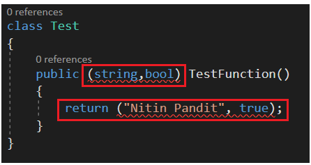 After creating a project file (.cs), I am just trying to create a function in Test class, which is returning more than one value. But, here comes an issue - It shows me an error. Since we know that C# 7.0 allows us to return more than one value, there must be some solution. Well, here it is. If you want to use that behavior of C# 7.0, then you need to add a package from NuGet which is System.ValueTuple.