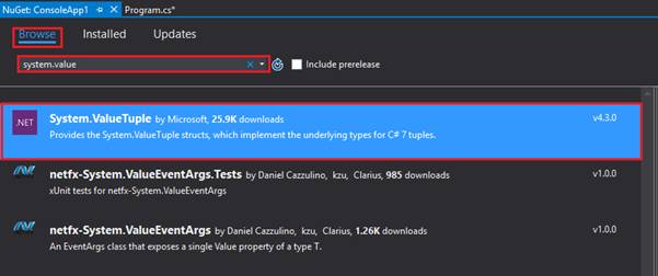 Now, select Browse for more online packages and find “System.ValueTuple” and install it.