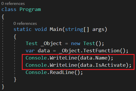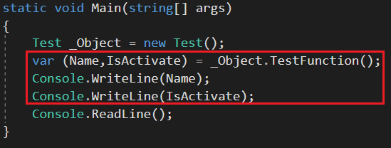 - One more way to use Tuple type - If you want to use these values returned by function individually instead of using them like an object’s property, you can hold them in a var type as in the following code and can use them individually.