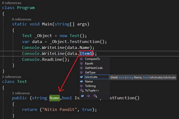 I have given a name to the first value but still I can call that by Item1 because that was on first position. Similarly, if you want to call IsActivate’s value, you can use Item2 . However, it will not be visible into Visual Studio intelliSense and you will have to type it manually.