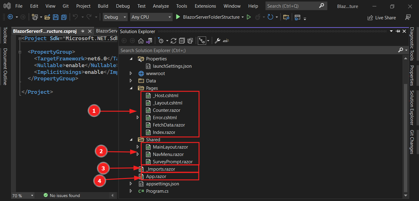 - Pages and shared folders would have some pages, which will be CSS, HTML, as well as razor components. The one that ends with .cshtml, are the reserved pages that you would have already worked on if you have worked with the MVC application. But we have something new here which is .razor these are called razor components.