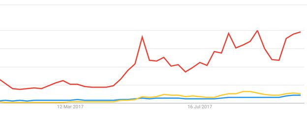 The following chart shows Google Trends for blockchain (blue), cryptocurrency (yellow), and bitcoin (red).
