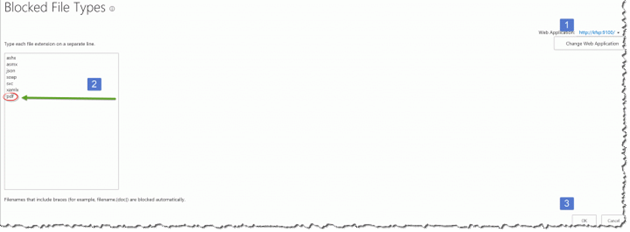 - To block an additional file type, scroll to the bottom of the page and type each file name extension on a separate line text box, type the file name extension (2) that you want to block, and then click OK (3).