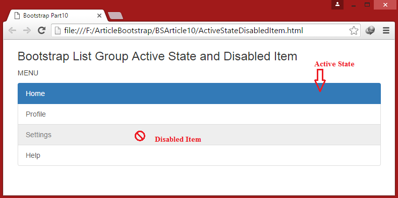 Lets create example of Active State and Disabled Item In List Group by writing following code.