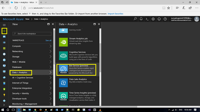 click->New->Data+ Analytics-> select Bot service(Preview).