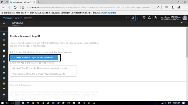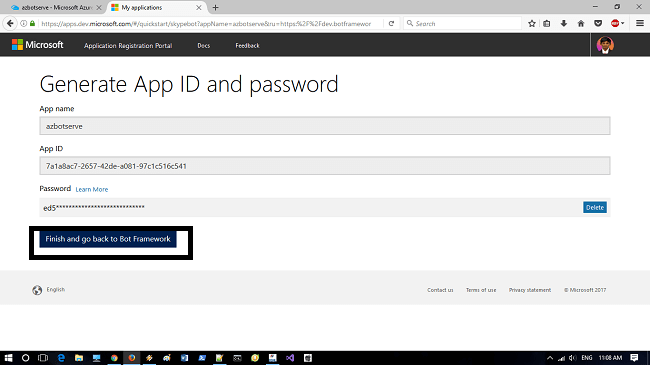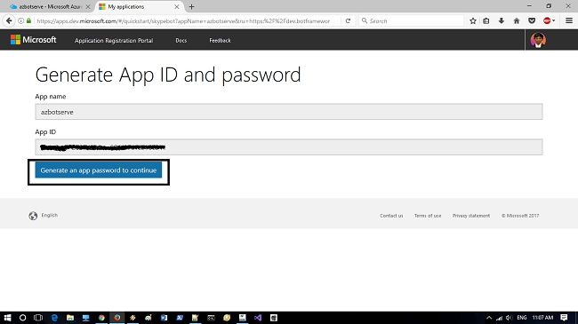 After receiving the successful deployment message notifications, we need to create app id and password for framework of the bot service.