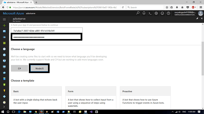 Now we need to paste the password that has been noted down in previous steps, and select the programming language template for bot service development.(Since I have selected NodeJS for my bot service, you can select the c# for bot development).