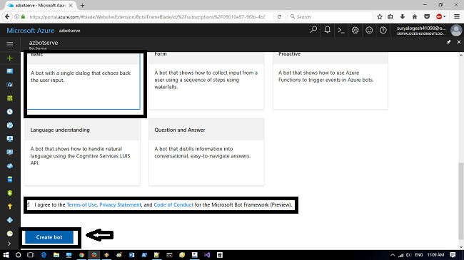 The template for developing the bot must be selected and I have selected the basic template for the bot service and thn click->create bot.