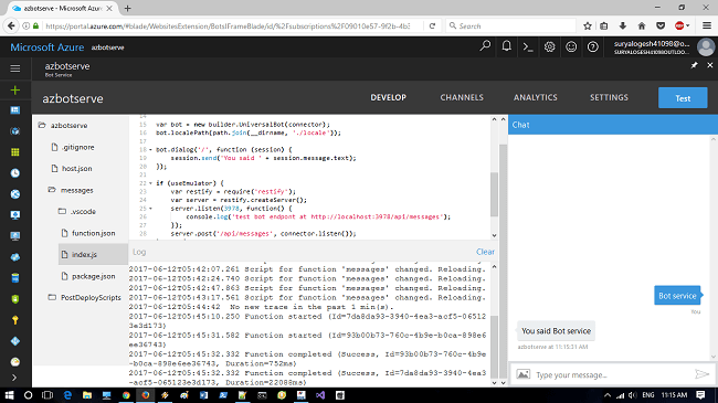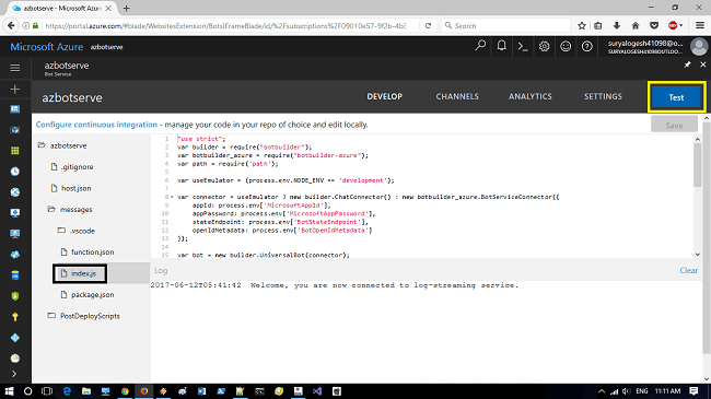 Bot service has been created so that we can test the bot chat control by sending the message to it and click->test.