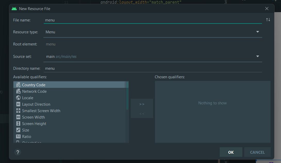 Go to the res folder and create a new Android Resouce Directory. Name the directory menu, select the resource type menu, and click on OK.