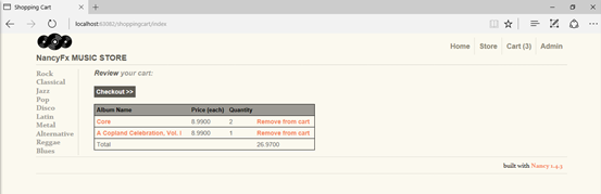 - @inherits Nancy.ViewEngines.Razor.NancyRazorViewBase<NancyMusicStore.ViewModels.ShoppingCartViewModel>