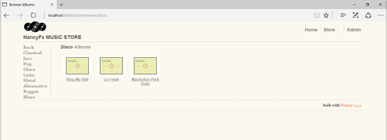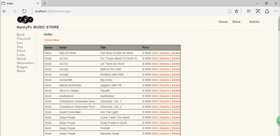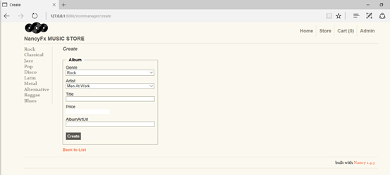 When we post a new album in the create view, the Post["/Create"] will deal with the request. We need to use another feature of Nancy - ModelBinding. The details of the album which we want to create will be bound to the parameter album. Now, we call the storeprocedure to create a new album in PostgreSQL.