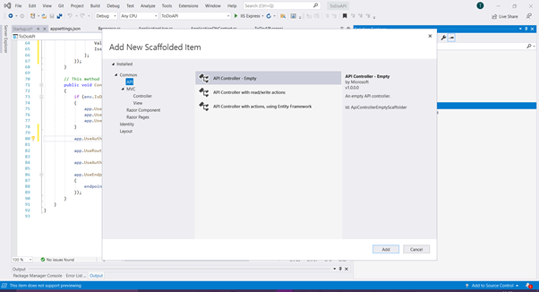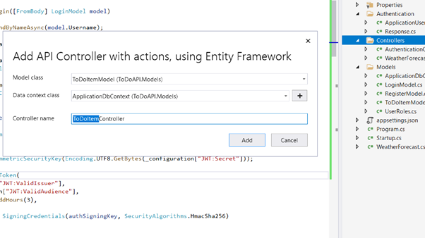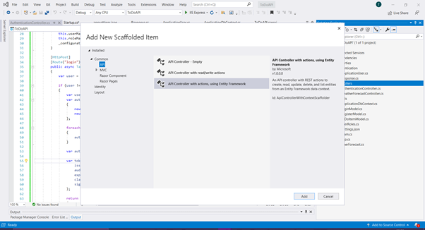 Create a Web API controller ToDoItem. This is done by right-clicking on the Controllers folder, select add, choose “New Scaffolded Item” from the drop-down and then select API Controller with actions, using Entity Framework.