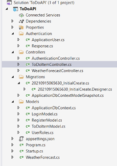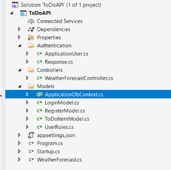Create a models folder, Models, that will contain a RegisterModel.cs class for user registration, a LoginModel.cs class for user login, UserRoles.cs for user roles and ToDoItemModel.cs for to-do items. It will also contain the ApplicationDbContext.cs file that maps the models to the tables that will be created through migration.
