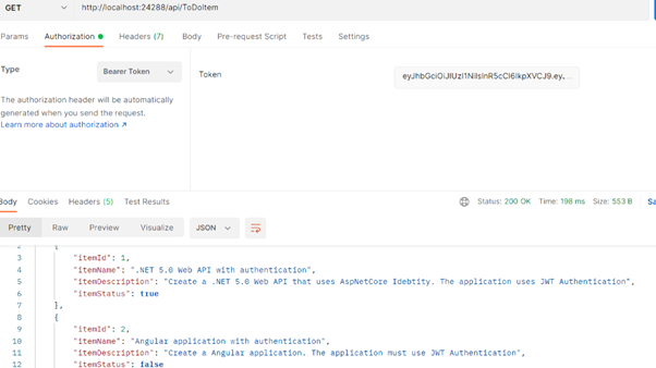 In this article, I showed how to build a ToDo list application backend using .Net 5.0. I also showed how to use the JWT token to authorize only logged-in users to use the ToDo application. In the next article, we going to implement the frontend using Angular. You can find the source code in my GitHub repository.