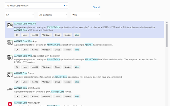 Choose the ASP.NET Core Web API template. The next step would be an option to give a project name and choose a location for the project.