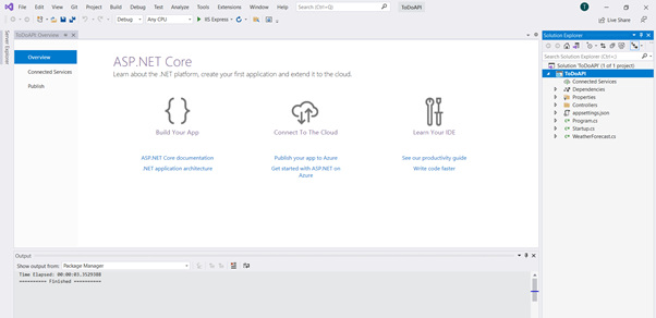 Install the latest version of the below packages using the NuGet package manager. The NuGet package manager can be found by right-clicking the project, in this example, the ToDoAPI, and select manage NuGet packages.