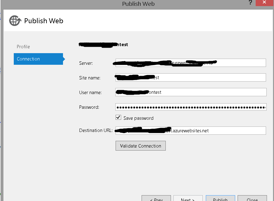 If you are not logging in with “Microsoft Azure WebSites” then first login, then form “Existing WebSites” select your app and click Ok. After clicking ok you will reach this window.