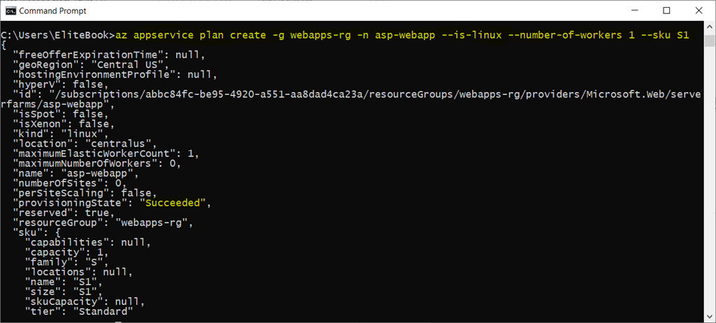 - az appservice plan create -g webapps-rg -n asp-webapp --is-linux --number-of-workers 1 --sku S1