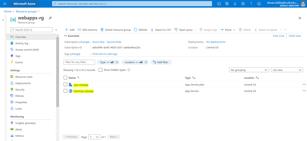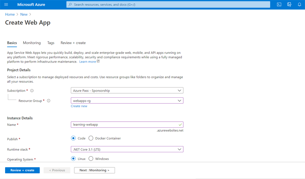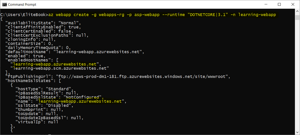 - az webapp create -g webapps-rg -p asp-webapp --runtime "DOTNETCORE|3.1" -n learning-webapp