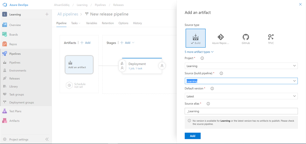 Click on add artifacts and choose the build and select the Source, Default version, and Source alias then hit the Add button.