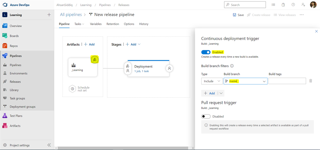 Enable the continuous deployment trigger by clicking on this event type button and enable the toggle and add the build branch then save the release pipeline. Now our release pipeline is also ready to run.