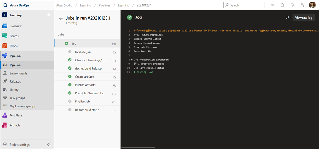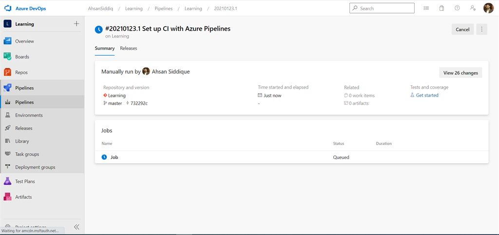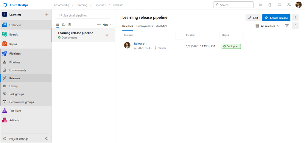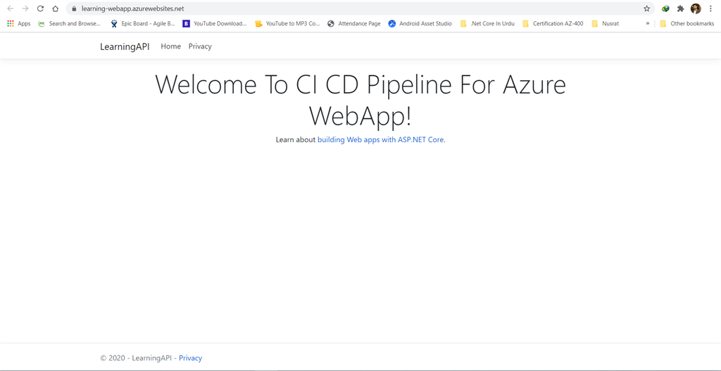 We have successfully created a build and release pipeline for our Azure web app. Add any change to your source code and push it to the repo, then you will see build pipeline will run and build the code and publish the artifacts. Then release pipeline will deploy the latest artifacts to the Azure web app.