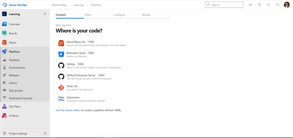 Next, click on the Pipeline tab and then choose the pipelines. This pipeline will build the source code and then create the artifacts and publish the artifacts. Click on create pipeline and choose the source code option. As I mentioned earlier that, I am using Azure Repos for my source code. I will select the Azure repo git option.
