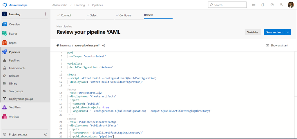 Replace the following code in the azure pipelines file and click on Save and Run.