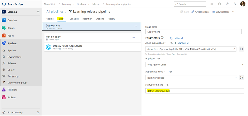 Click on tasks and select your Azure subscription and App type, App service name, and Startup command. As you can see, I added the dotnet LearningAPI.dll command because I have created the Linux environment therefore this is compulsory to put this startup command.