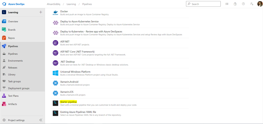 Next, select a starter pipeline template because I will use my own commands to build any dot net core web app. You can use it for any of your dot net core web apps.