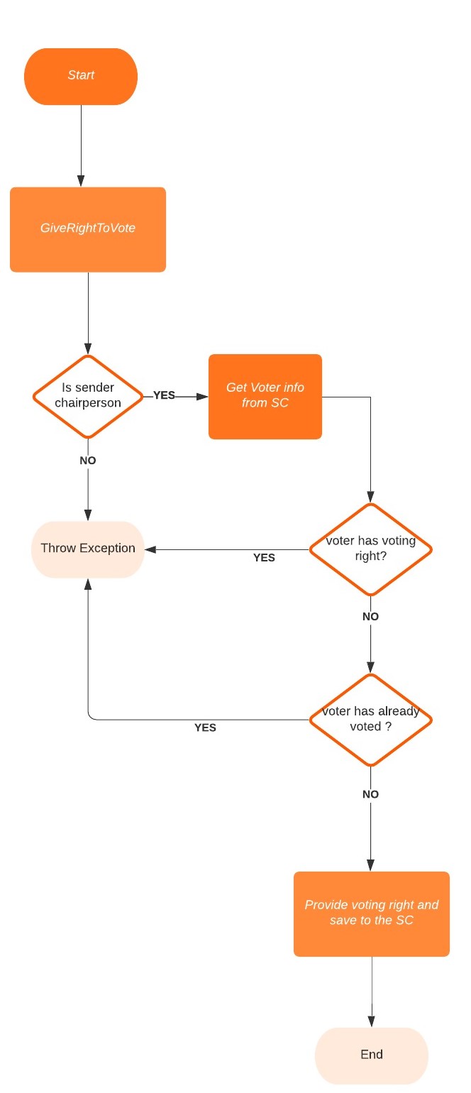 We have set the proposal's value and chairperson wallet address. Now, let’s add a method to give a voting right to the user. Remember, only the chairperson can call this method.
