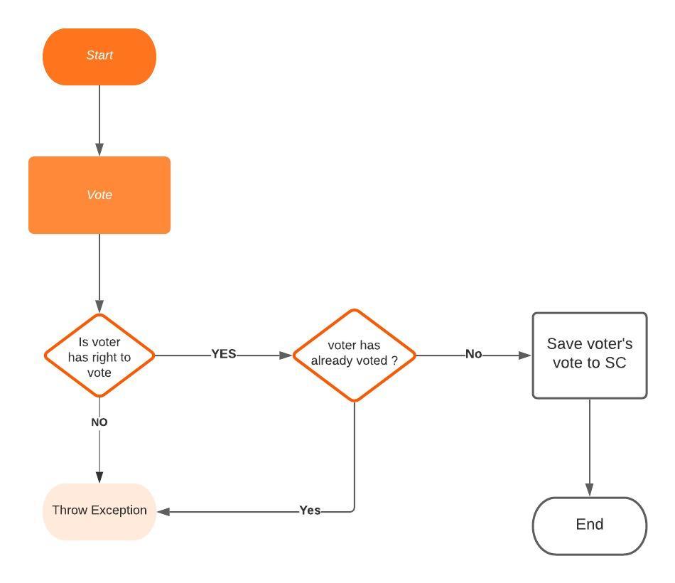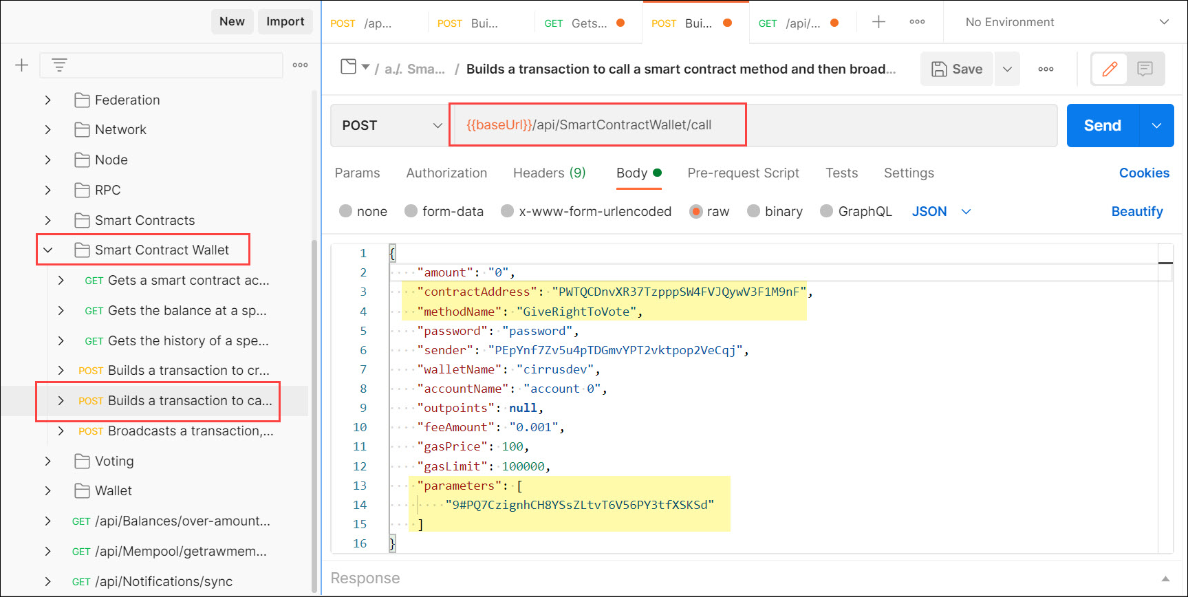 Then, a voter—with valid voting rights—can call the method “vote”. To call the method, we are using the same endpoint by changing parameters.