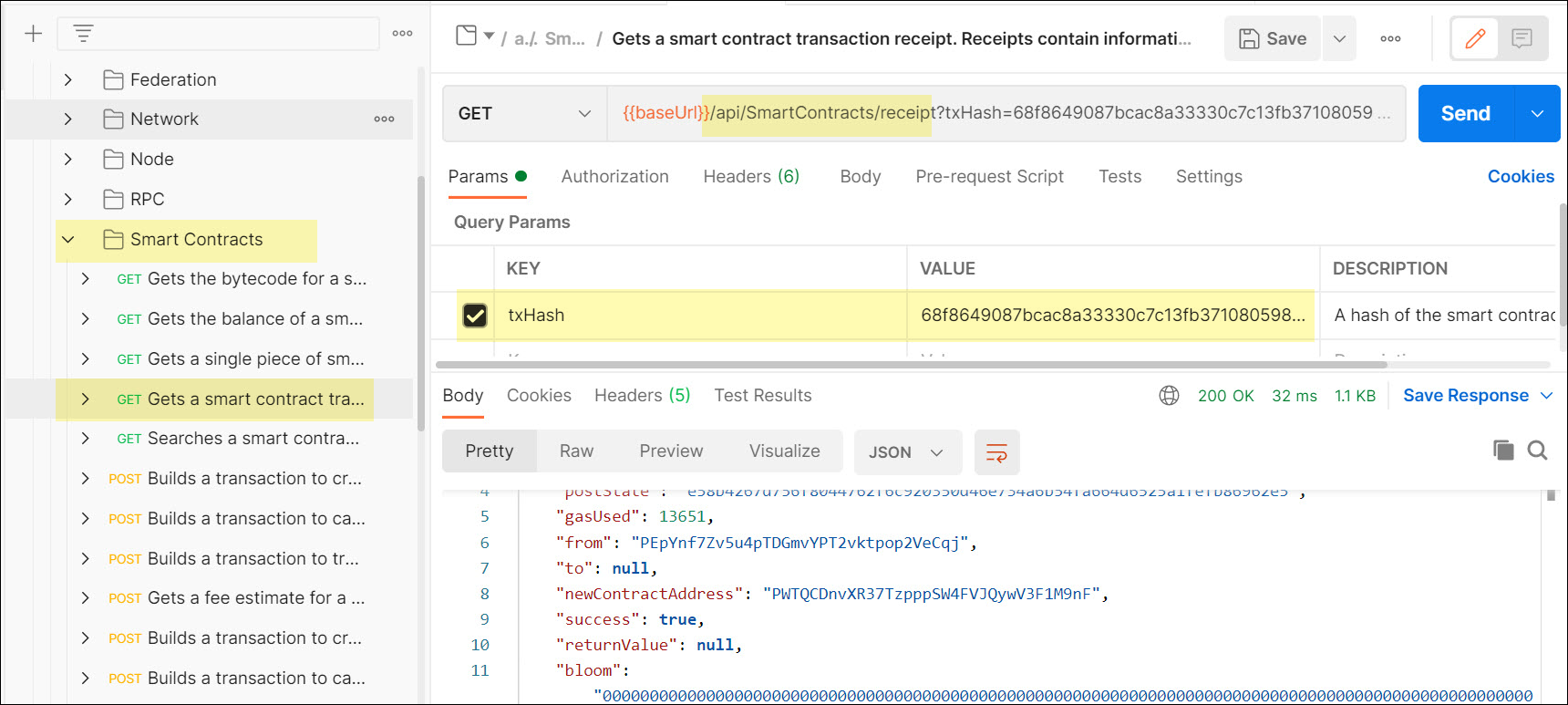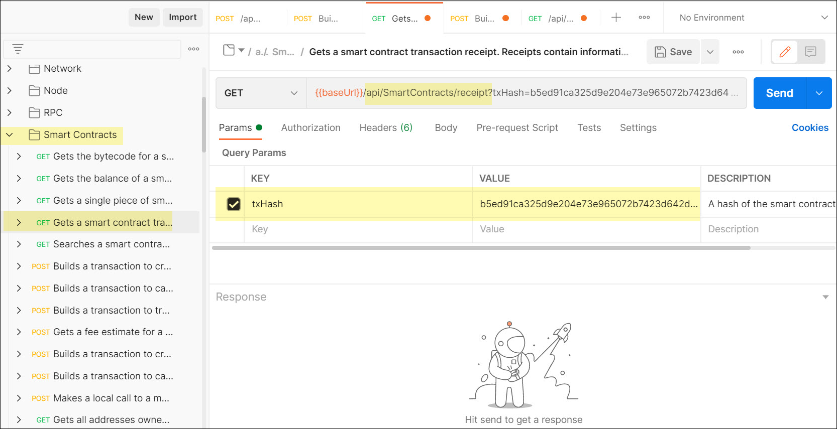 Find receipt API from the Smart Contracts folder in the collection. Provide transaction hash in the query parameter.