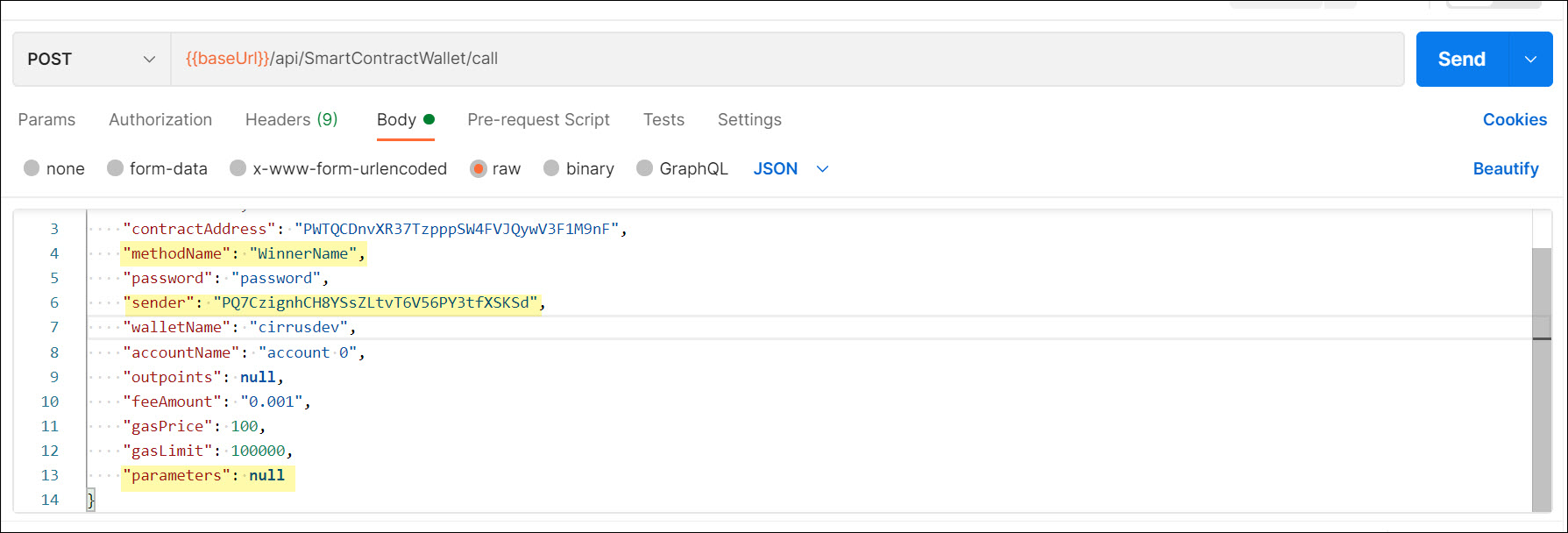 Let’s call the method “WinnerName”. Anyone can call this method, so we can pass any wallet address which has a balance. Let’s call it using the last voter’s wallet address.