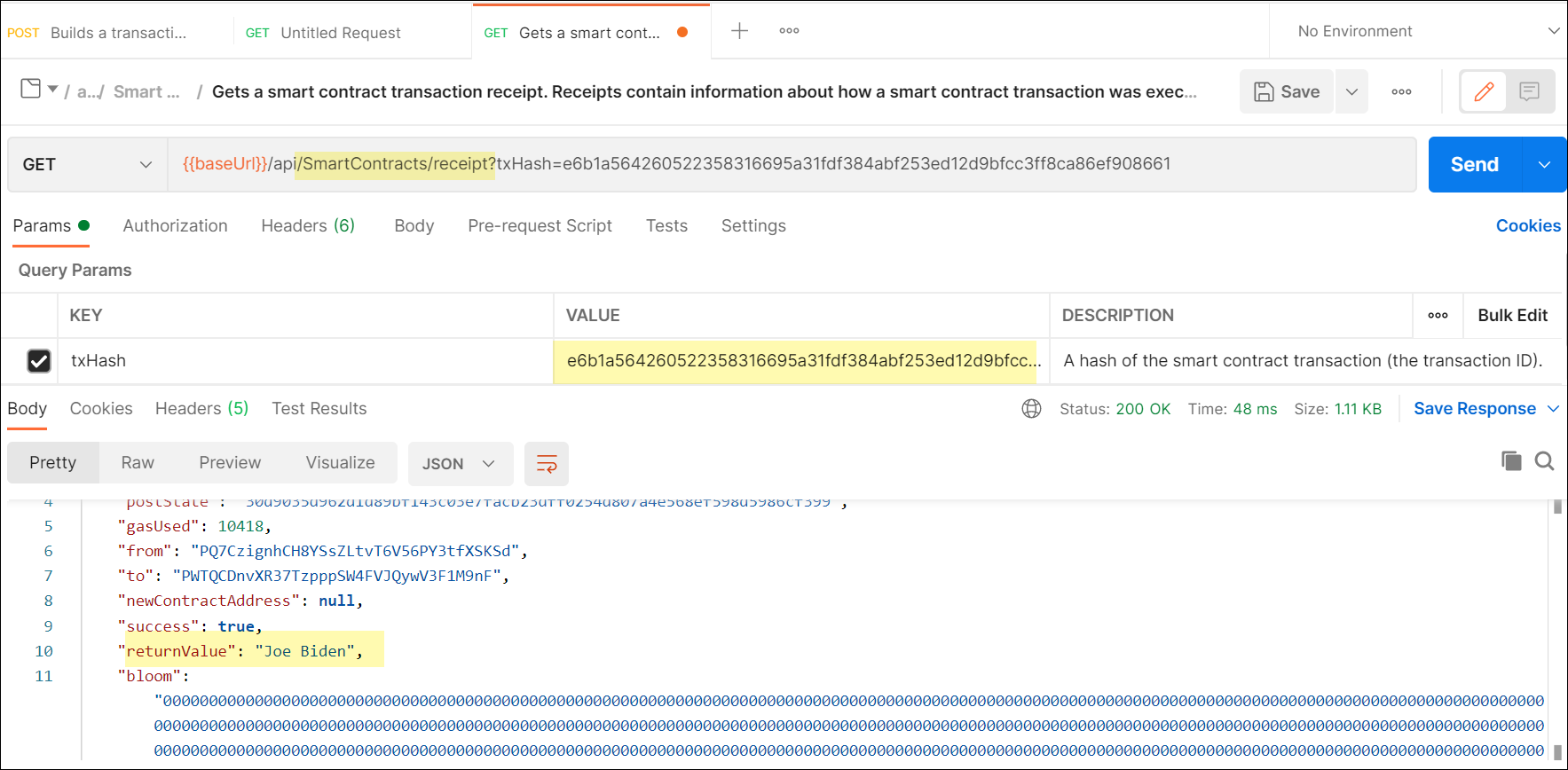 This will return the transaction id, that needs to pass to the smart contract receipt endpoint to get the result.