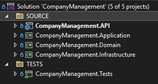 At the root of the project, the CompanyManagement folder contains five main subfolders aligned with Clean Architecture principles.