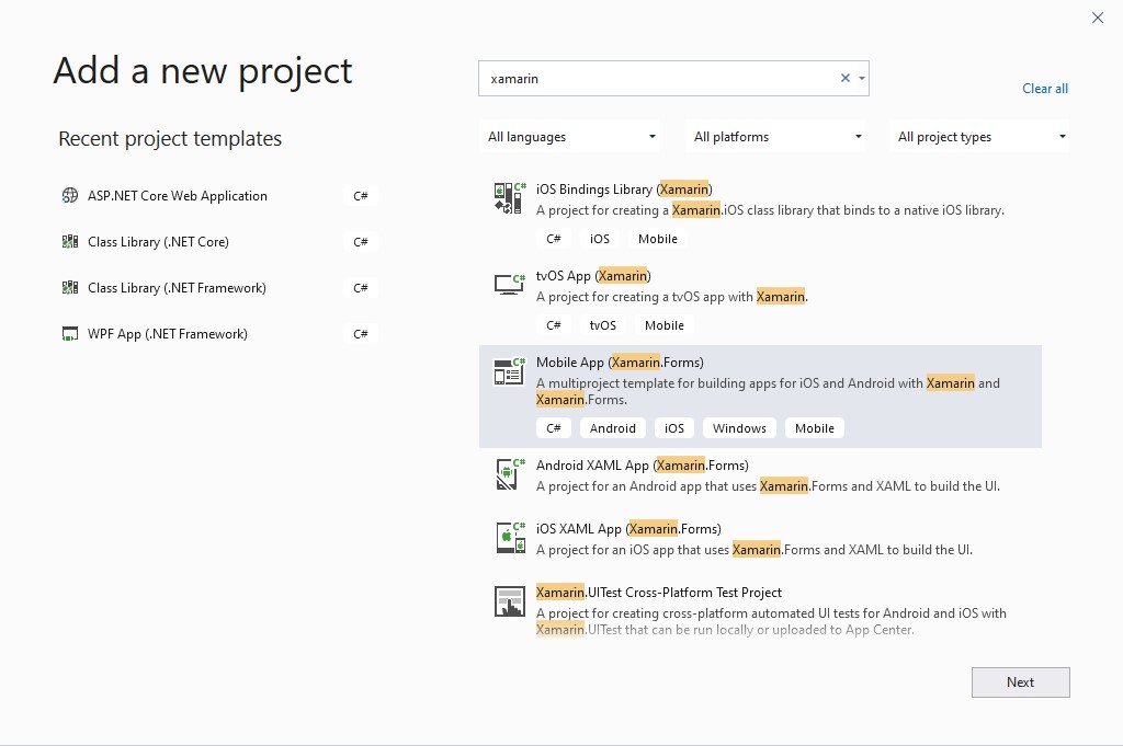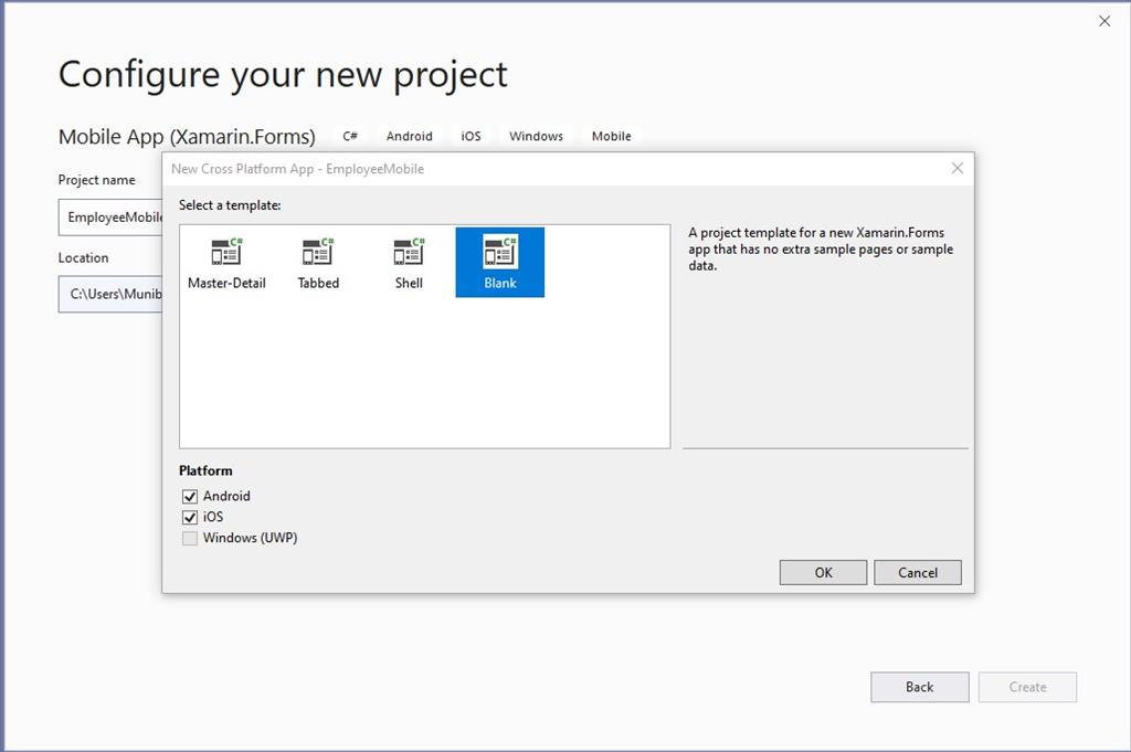 We now look at the presentation layer, which we will build using the Xamarin forms template. We start by creating a new project as below: