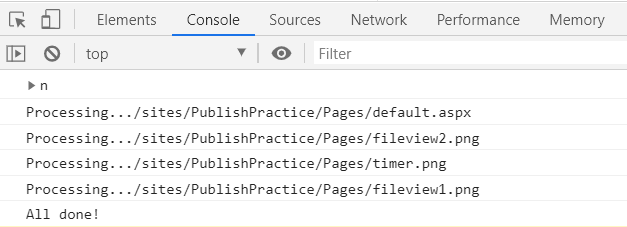 - console.log( "Processing..." + " "  +item.File.ServerRelativeUrl);}