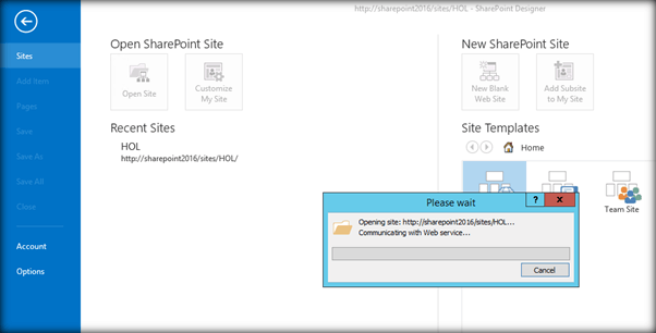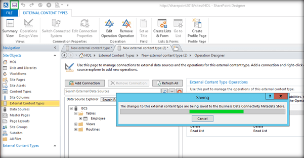 So, let’s create a BCS connection using SharePoint designer. There is no specific designer available for SharePoint 2016, so spin up SharePoint Designer 2013 and connect to the SharePoint Site where we will be creating the external content type list.