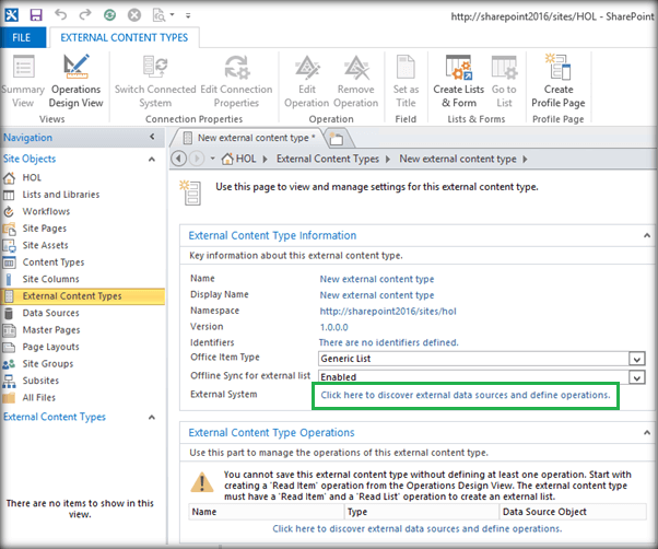 This will open up the page that can be used to manage the settings for the external content type. Click on “Click here to discover external data sources and define the operations”.