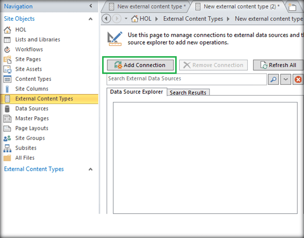 From the left pane select ‘External Content Types’ and select ‘External Content Type’ from the top bar.
