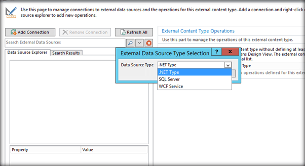 It will open up the External Data Source Type selection window. Select ‘SQL Server’.