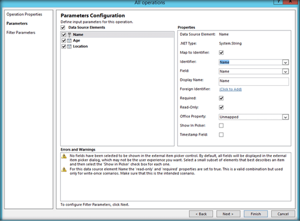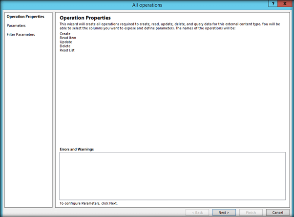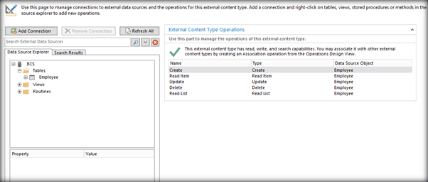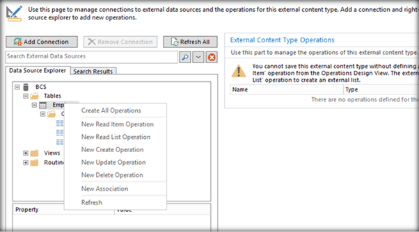 Right click on the table and specify the kind of operations that can be done using the BCS Connection. In this case I am going with ‘Create All Operations’ to define complete CRUD.