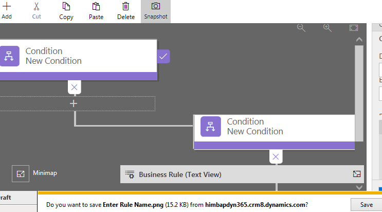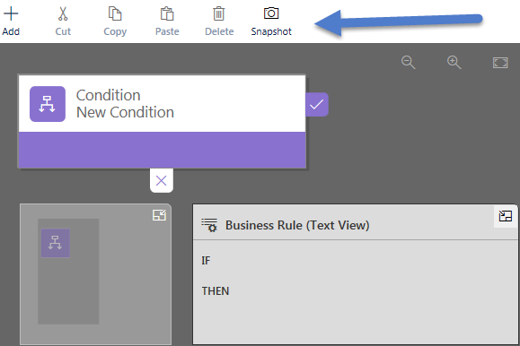 It also contains a new toolbar in designer itself, which can be used to add/remove the business rules actions and conditions. We can also reuse actions and condition now, using the copy and paste button. This toolbar also contains a snapshot button, which is very helpful, if you are preparing a technical design document and you want to use business rule screenshot in your document. It allows you to take a snapshot of the existing business rule actions and conditions.