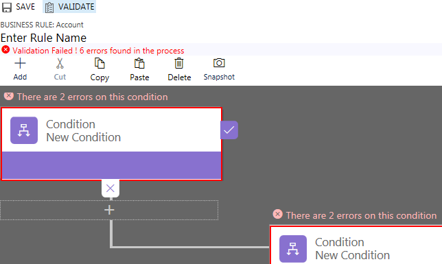 The new VALIDATE button over command bar can be used to identify potential errors. We can validate our business rule with this button and it will show the notification, if there is any error in the business rule, as shown below.