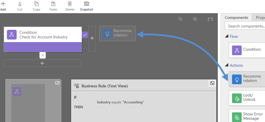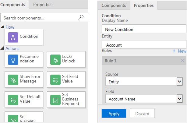 Dynamics 365 replaced business rule designer with a completely new look and feel. The new designer supports drag and drop feature. Now, we can add conditions and actions by dragging from Components tab.