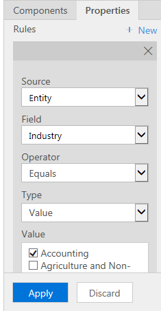 - Select default new condition and configure the properties, as shown below to check the industry type and click Apply button.